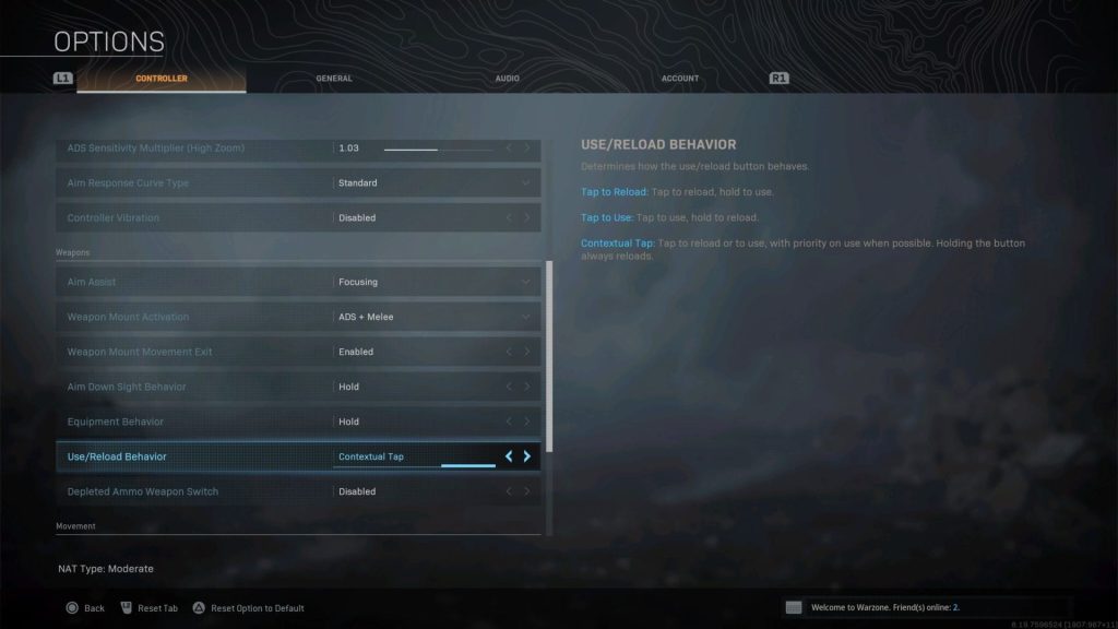 El toque contextual se puede activar en PC, Xbox y PlayStation en el menú Configuración; ve a “Configuración del mando”, desplázate hacia abajo hasta la sección “Armas” y cambia la opción “Usar/Recargar comportamiento” de “Predeterminado” a “Toque contextual”. Pero ten en cuenta que esta es una opción para los mandos, así que si usas el teclado y el ratón en su lugar, no conseguirás nada.