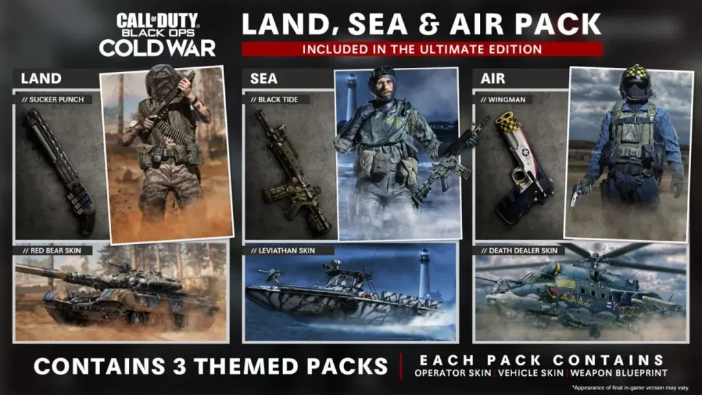 - Paquete de tierra, mar y aire (3 diseños de operador, 3 diseños de vehículo, 3 planos de armas)